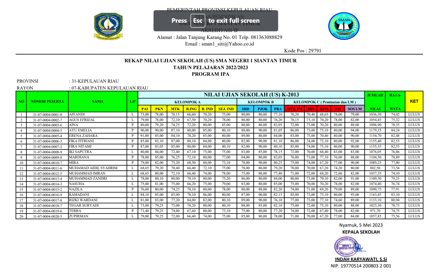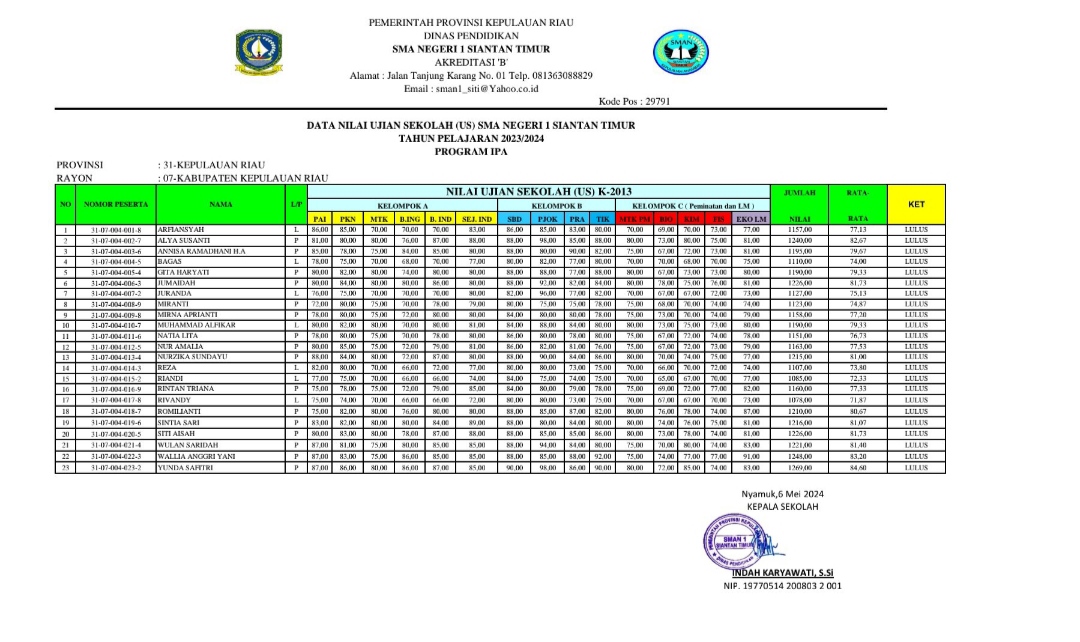 PENGUMUMAN KELULUSAN SISWA SMAN 1 SIANTAN TIMUR IPA